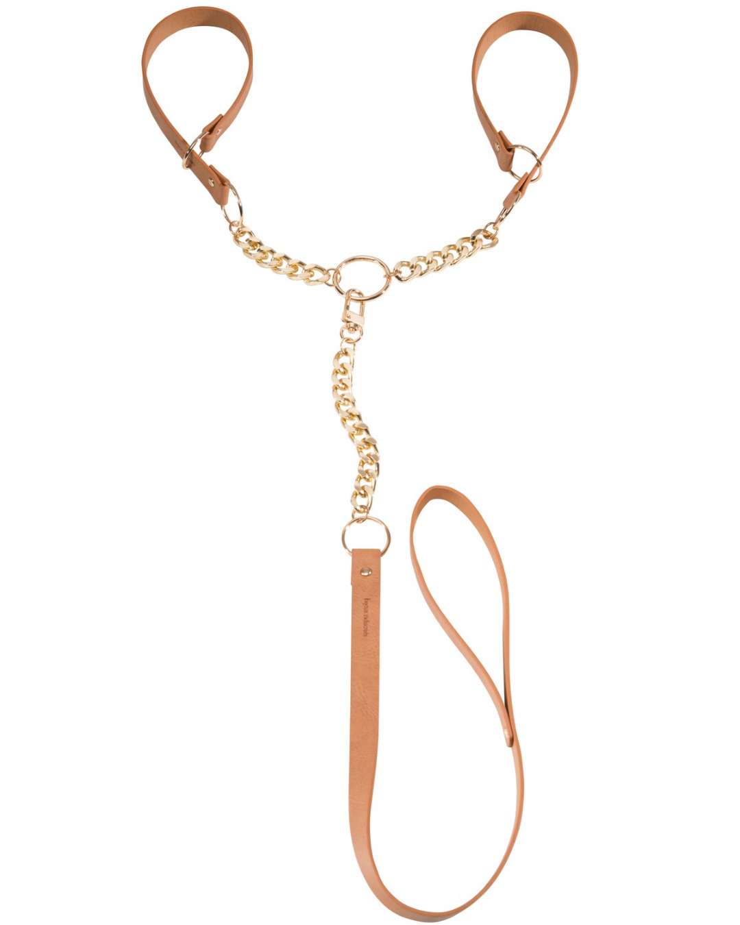 Complementa tu look con estas sexy y elegantes esposas marrón claro con correa dorada para explorar nuevas fantasías, ¿Te atreves?